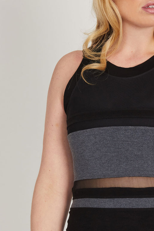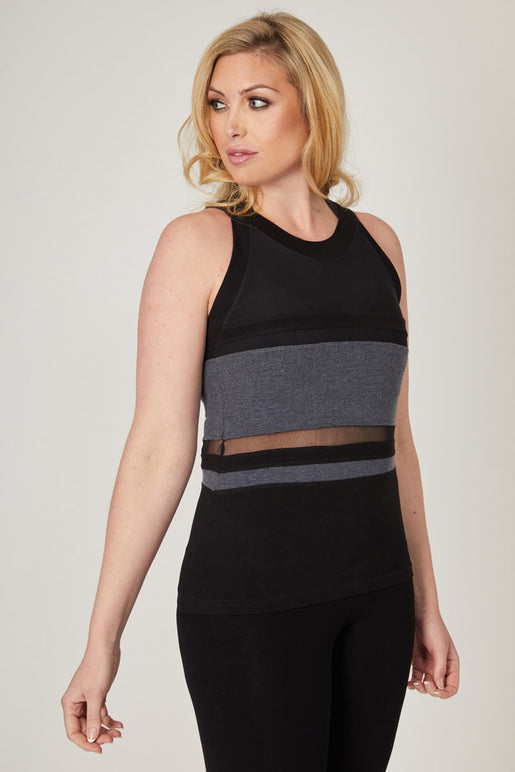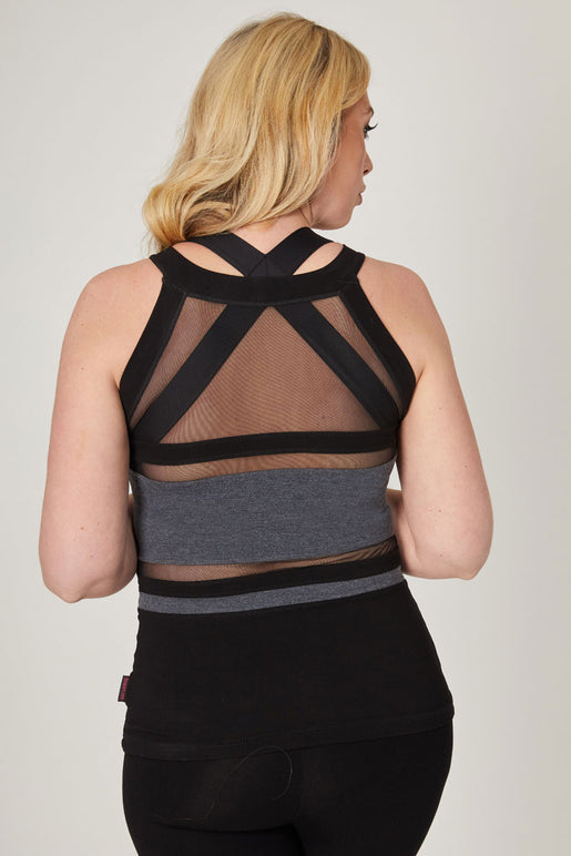 Marl grey and mesh horizontal panelling frame the waist and bust perfectly - turn the top around and showcase the single layer mesh front for a more exposed look. This top doesn't come with a bra lining so team it up with one of your own or our Luxe Cross Back bra (model wears). As part of our move towards more sustainable fashion, this top has been made from our bespoke, high stretch and soft-feel fabric which won't lose shape or colour over time - which will keep it looking new for years.