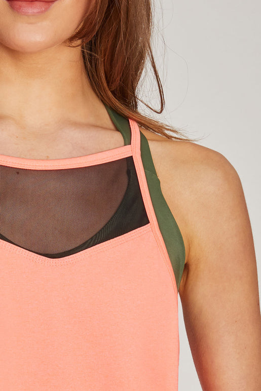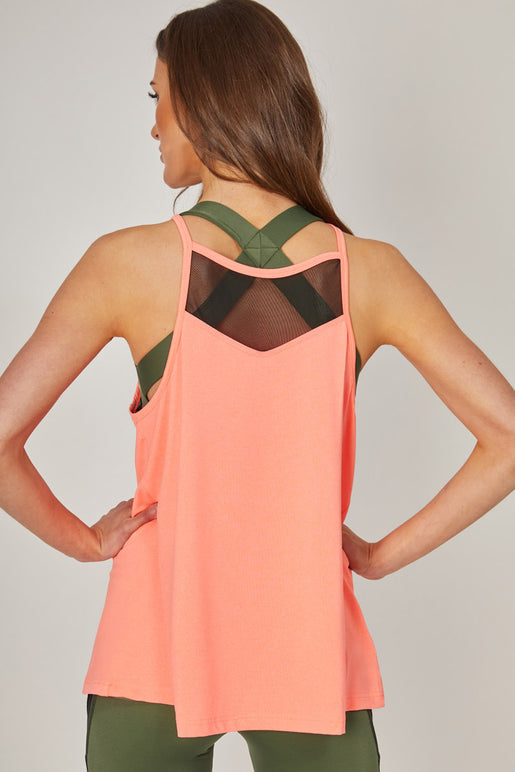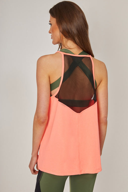 This top was designed to throw on before and after a work out. The lightweight, sweat-wicking fabric and loose-fit will keep you cool during warmer weather. Simply turn the top around for an extended mesh front - it's your top, so wear it your way. Summery bright coral colour will get you noticed. Flattering A-line fit helps to avoid sweat marks.