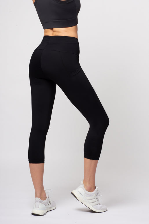 The ultimate cropped legging in style and function. Featuring a panel with a pocket on each leg, perfect to slip in a mobile phone or keys. Super, yet very stylish and comfortable. Smooth, flattering waistband for an optimum fit, these can take you from work to workout and anything in between! Made from exclusive TLC super stretch fabric. Available Black.
