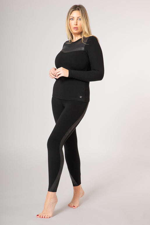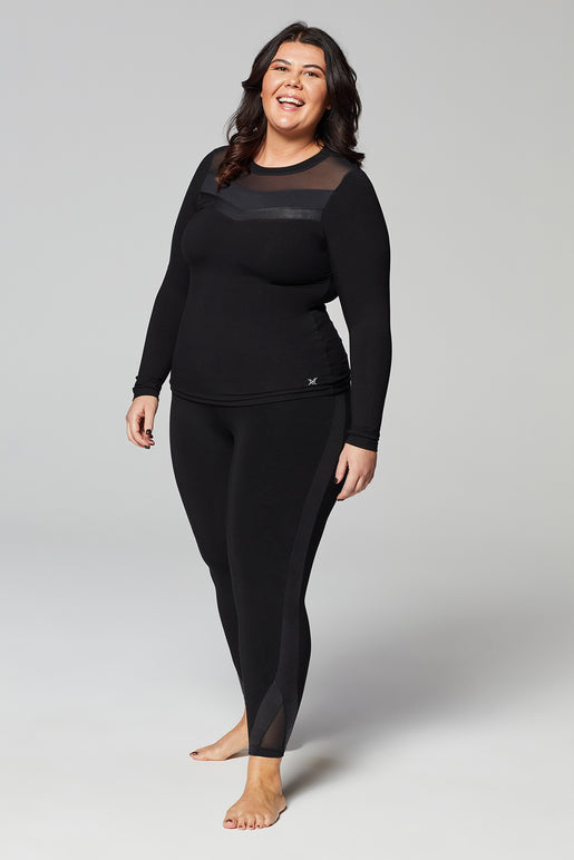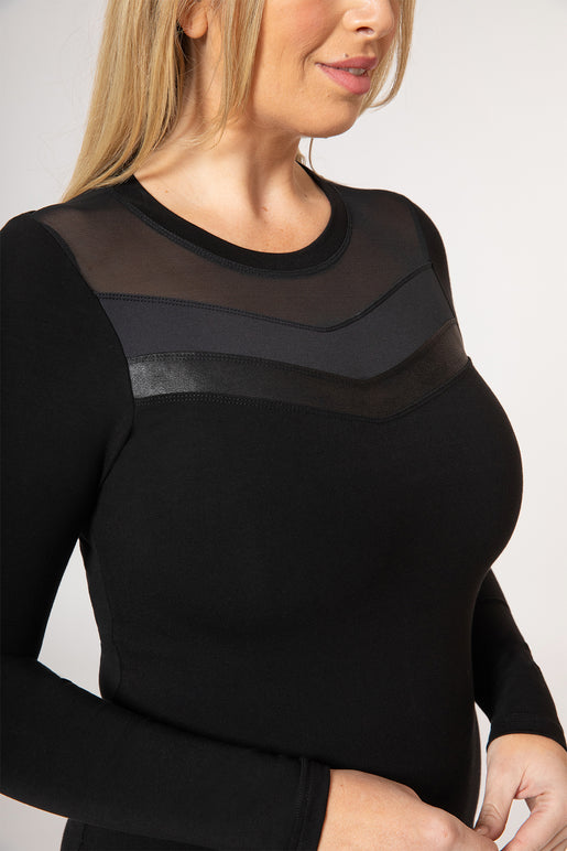 Body Sculpt Long Sleeve Full Length Mesh Detail Top with Built-In Bra Black
