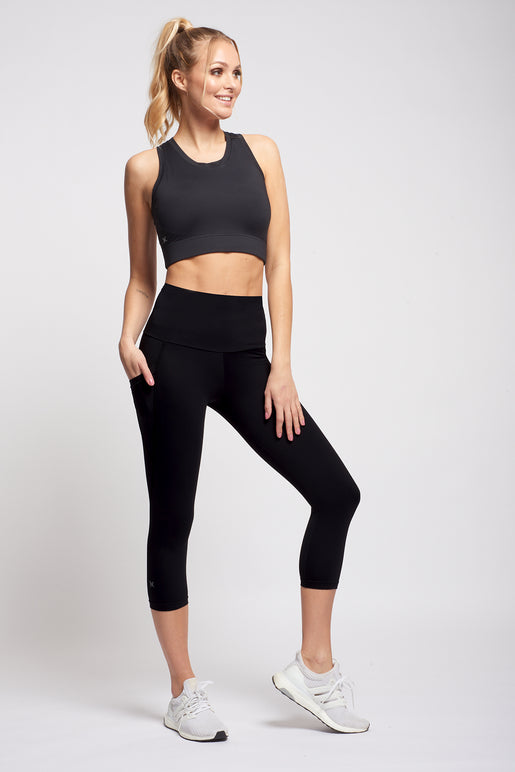 The ultimate cropped legging in style and function. Featuring a panel with a pocket on each leg, perfect to slip in a mobile phone or keys. Super, yet very stylish and comfortable. Smooth, flattering waistband for an optimum fit, these can take you from work to workout and anything in between! Made from exclusive TLC super stretch fabric. Available Black.