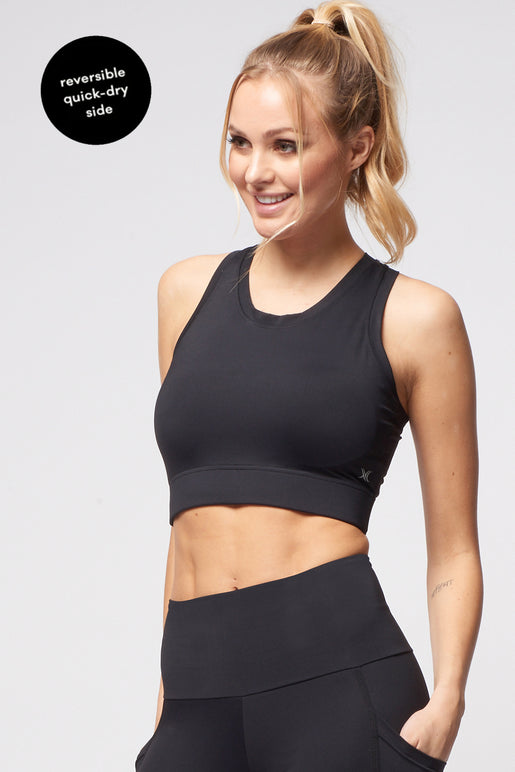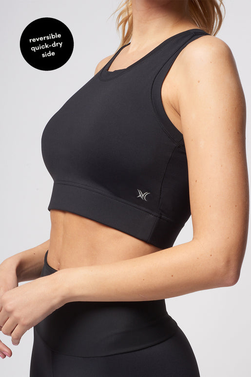 Two fabrics, one bra - this reversible black T-back design is made to lift, smooth and move with you. One side features our soft viscose blend for all-day comfort, while the other uses polyamide quick-dry fabric for workouts that go the distance. The sculpting stretch offers light-to-medium support with a flattering fit that hugs without constricting. Perfect for layering or wearing solo, it pairs seamlessly with both our figure-firming and quick-dry leggings for a coordinated look.
