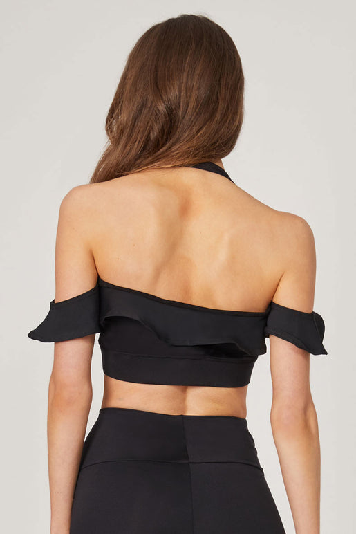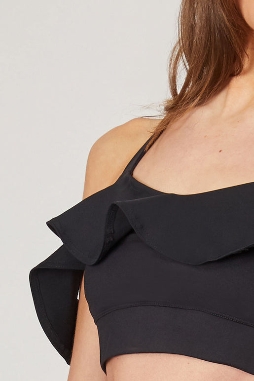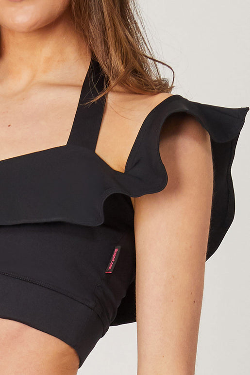 A stunning halter-neck gym bra with oversized frill trim. The frill has been made from a super stiff fabric, so you'll always get that structured look. Wear with the frill down to gently cover your arms, or lift them up on to your shoulder for added shape and structure to your look. Made from high stretch bespoke TLC fabric which won't lose shape or colour over time. All our bras are fully lined for your comfort and support.