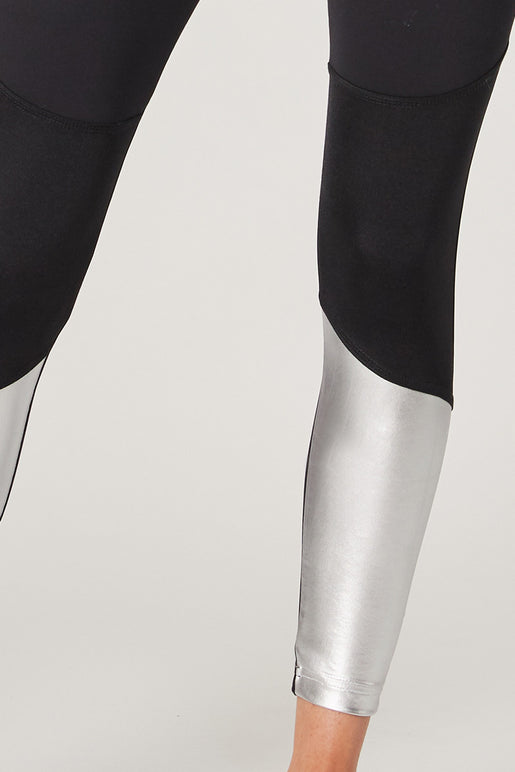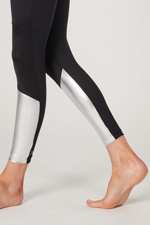 These show-stopping leggings feature metallic panelling to the lower leg for a super strong look. Slip them on and feel like a super-hero. Made from our trademark, high stretch and supportive fabric. Comes with a concealed zip big enough to store your card and keys.