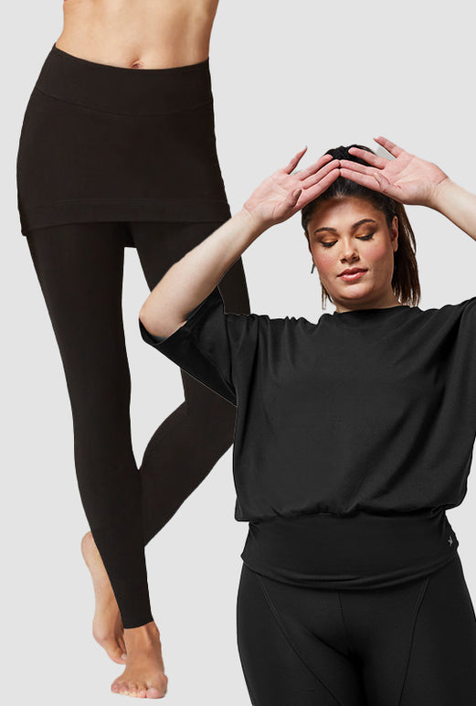 Yoga Elbow Sleeve Top with Cuffed Waistband Black + Medium Compression Waisted Leggings with Straight Skirt Black