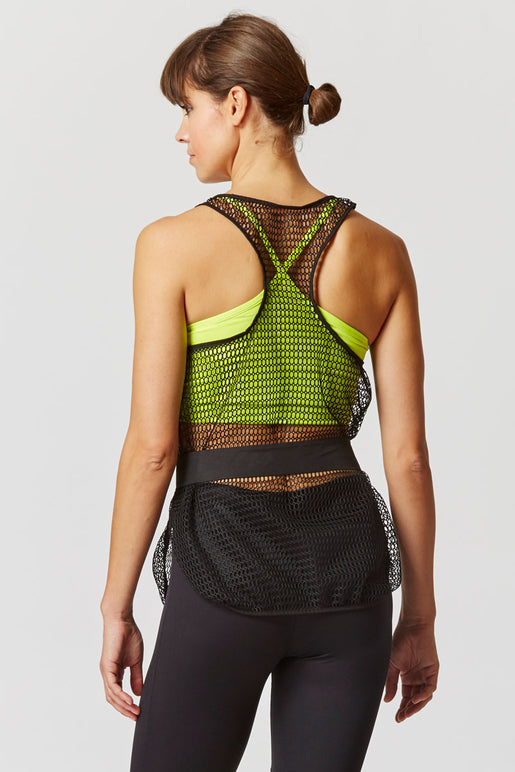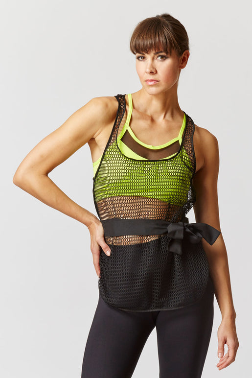 Get straight to the point with this gorgeous open-mesh tunic. Panel straps and coordinating trim is super stylish. Keeps you cool, covered and classy. Comes complete with a detachable belt to help you style it up. The ultimate post-workout throw on. Wear with one of our bright Reversible Bras to complete the look. Available Black only.