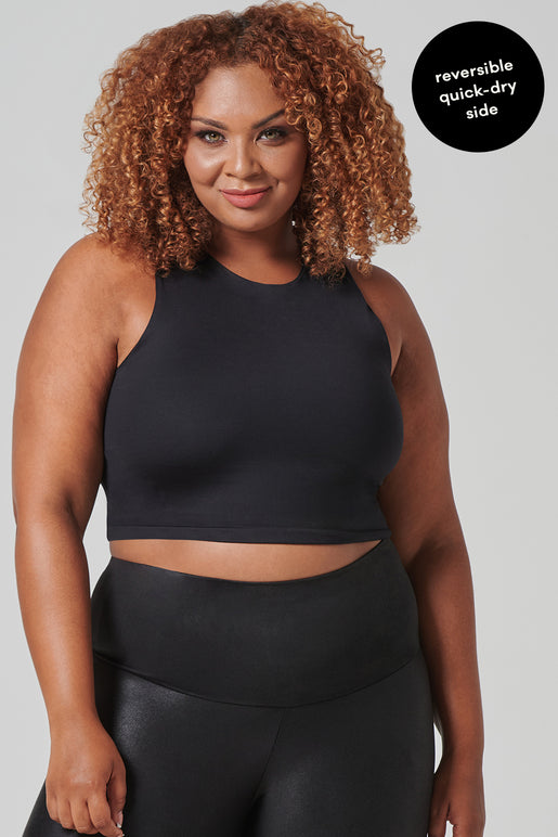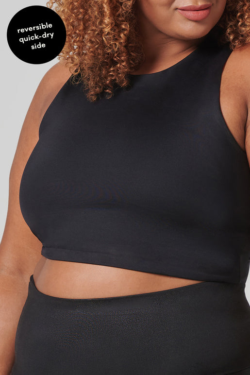 Two fabrics, one cropped tank - this black reversible crop top is designed to shape, support and move with you. One side is made from soft viscose for a cozy, everyday feel, while the other is polyamide quick-dry fabric for high-performance workouts. The wide-cut back provides extra coverage, making it perfect to layer or wear on its own, and pairs seamlessly with both your figure-firming and quick-dry leggings.