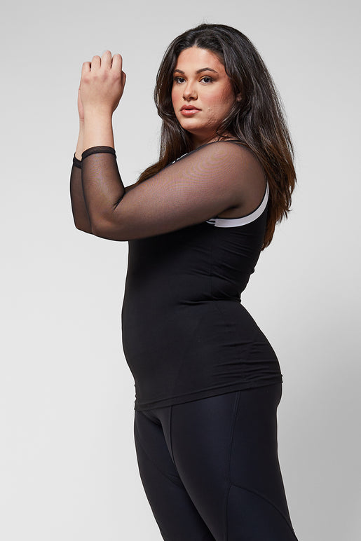 A stunning, sporty fitted top. Stretch mesh sleeves gently cover your arms whilst keeping you cool. Features an inbuilt bra shelf for additional support. High scoop neckline with inset contrasting panels at the shoulders. Reverse the top back to front for either zebra or white Raglan band detailing. Made from lightweight, sweat wicking fabric and high stretch mesh. A must-have for any work-out!